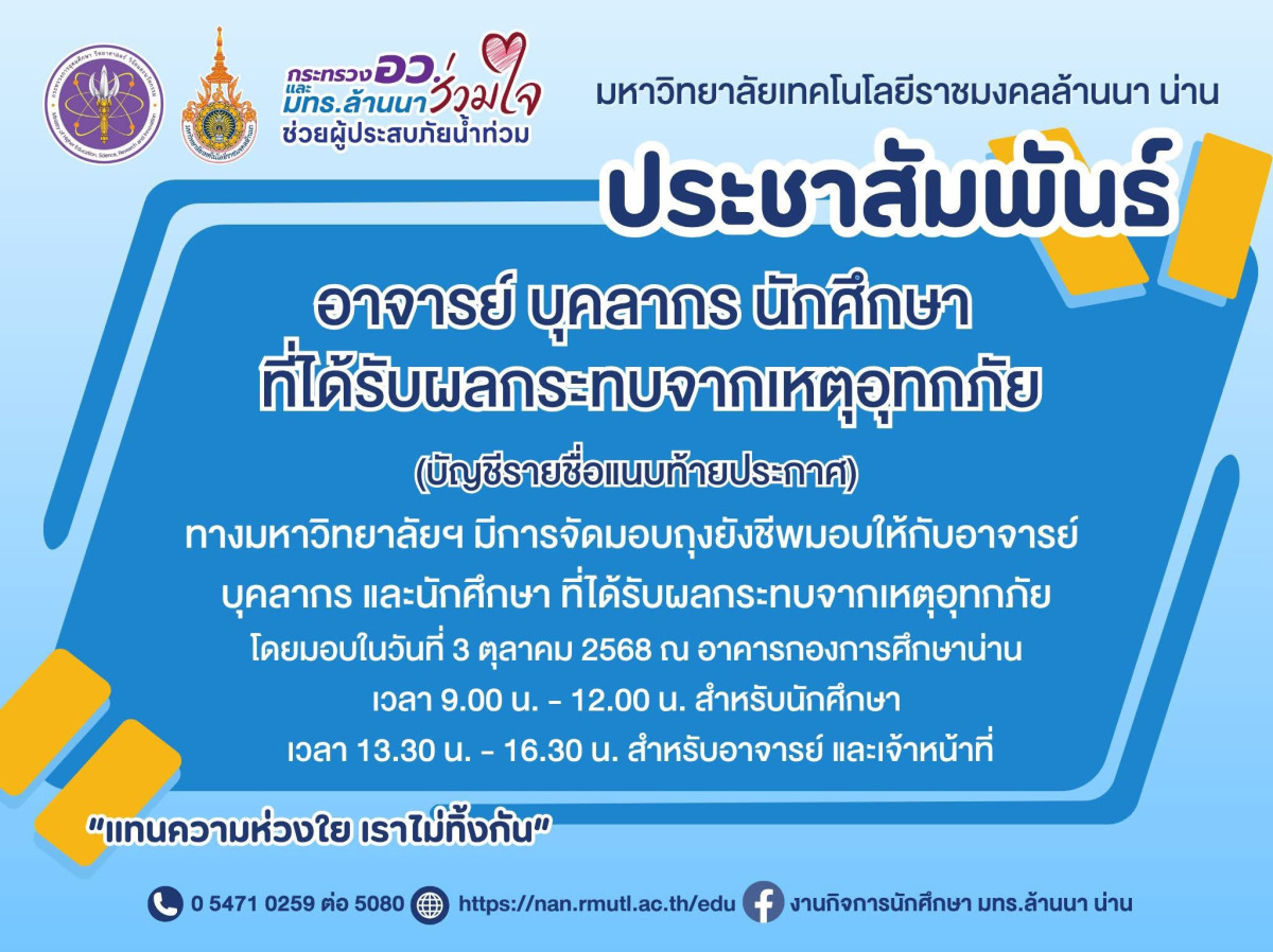 วันศุกร์ที่ 3 ตุลาคม 2568 มหาวิทยาลัยเทคโนโลยีราชมงคลล้านนา น่าน ได้มอบถุงยังชีพมอบให้กับผู้ที่ได้รับผลกระทบเหตุอุทกภัยจากพายุ "วิภา" ในช่วงที่ผ่านมา โดย ผศ.ดร.วิโรจน์...