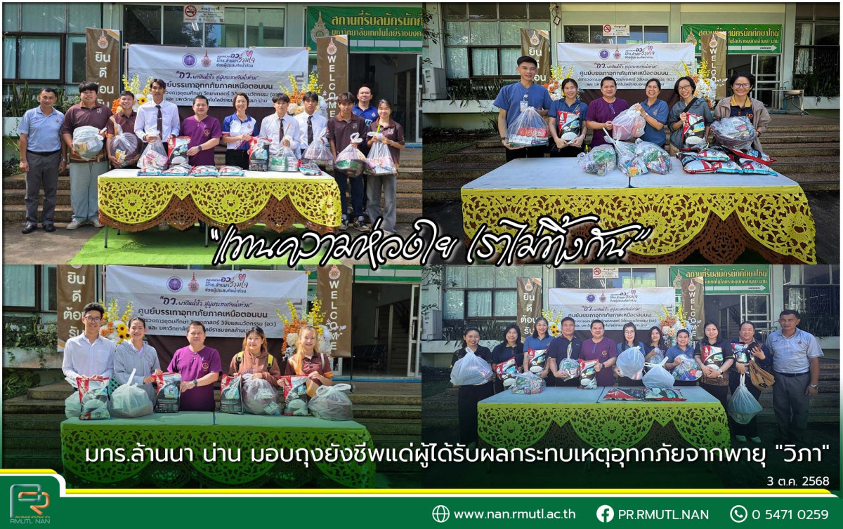วันศุกร์ที่ 3 ตุลาคม 2568 มหาวิทยาลัยเทคโนโลยีราชมงคลล้านนา น่าน ได้มอบถุงยังชีพมอบให้กับผู้ที่ได้รับผลกระทบเหตุอุทกภัยจากพายุ "วิภา" ในช่วงที่ผ่านมา โดย ผศ.ดร.วิโรจน์ มงคลเทพ ผู้อำนวยการสำนักงานบริหารมหาวิทยาลัย , นางนลัทพร คูหา ผู้อำนวยการกองการศึกษา เป็นตัวแทนมอบถุงยังชีพให้กับอาจารย์ บุคลากร และนักศึกษา ณ อาคารกองการศึกษาน่าน