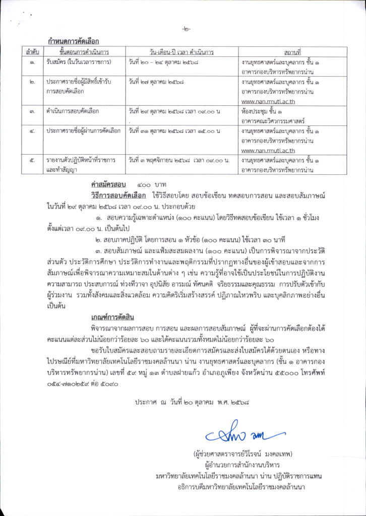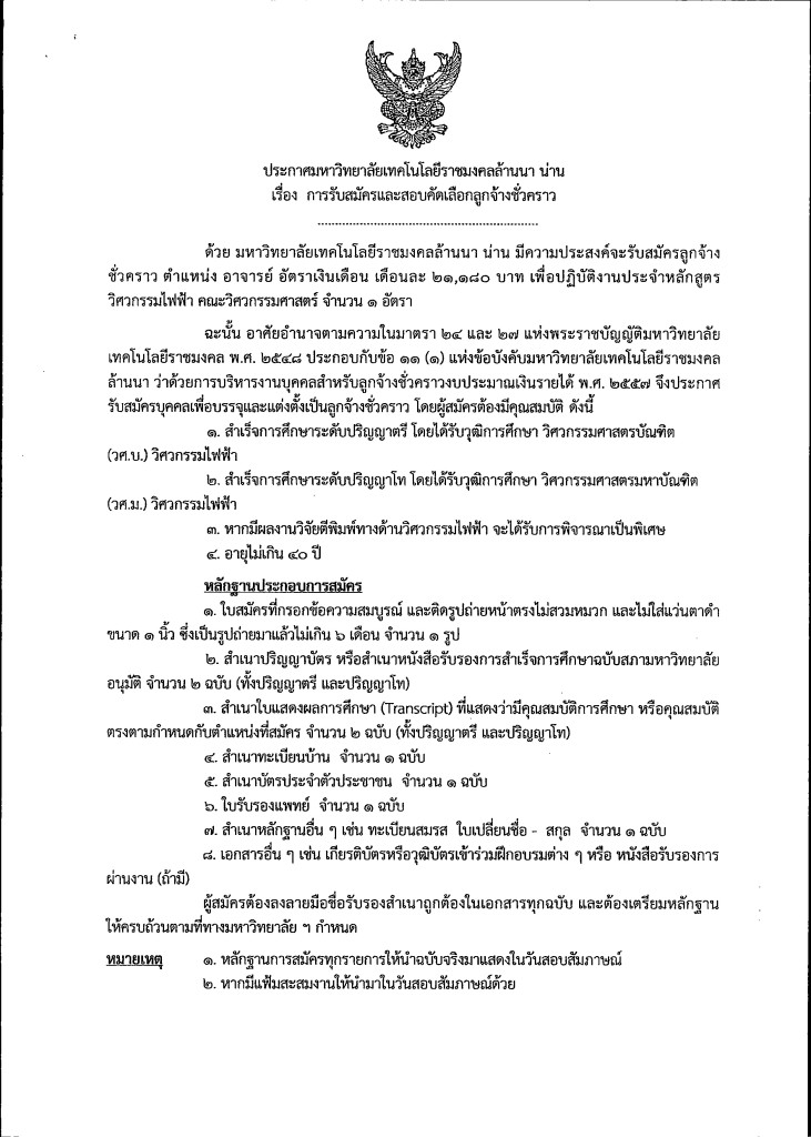 ด้วย มหาวิทยาลัยเทคโนโลยีราชมงคลล้านนา น่าน มีความประสงค์จะรับสมัครลูกจ้างชั่วคราว ตำแหน่ง อาจารย์ อัตราเงินเดือน เดือนละ ๒๑,๑๘๐ บาท เพื่อปฏิบัติงานประจำหลักสูตรวิศวกรรมไฟฟ้า คณะวิศวกรรมศาสตร์ จำนวน ๑ อัตรา