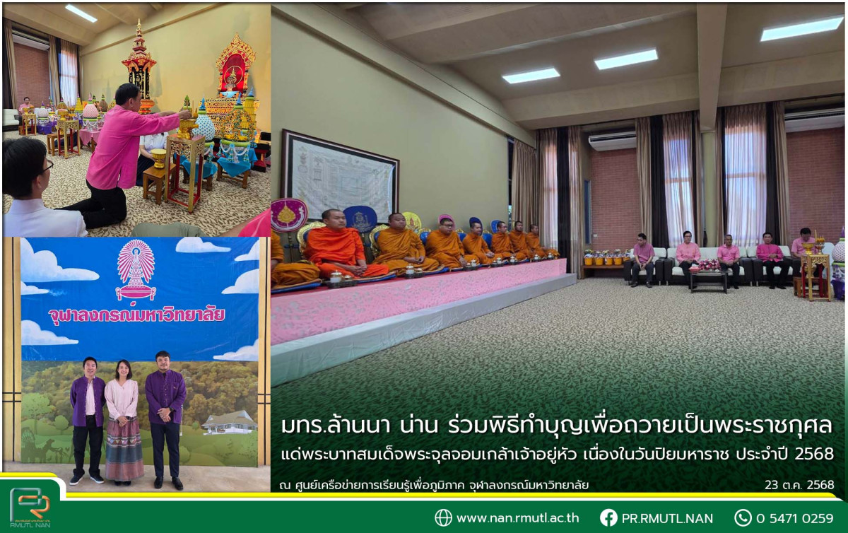 วันพฤหัสบดีที่ 23 ตุลาคม 2568 ผู้ช่วยศาสตราจารย์ ดร.กันยาพร ไชยวงศ์ รองคณบดีคณะวิศวกรรมศาสตร์ นำอาจารย์คณะ เข้าร่วมพิธีทำบุญเพื่อถวายเป็นพระราชกุศล แด่พระบาทสมเด็จพระจุลจอมเกล้าเจ้าอยู่หัว เนื่องในวันปิยมหาราช ประจำปี 2568 ณ ศูนย์เครือข่ายการเรียนรู้เพื่อภูมิภาค จุฬาลงกรณ์มหาวิทยาลัย ต.ผาสิงห์ อ.เมืองน่าน จ.น่าน โดยมี นายบรรจง ขุนเพชร รองผู้ว่าราชการจังหวัดน่าน เป็นประธานในพิธี เพื่อรำลึกถึงพระมหากรุณาธิคุณอันหาที่สุดมิได้ของ พระบาทสมเด็จพระจุลจอมเกล้าเจ้าอยู่หัว ผู้ทรงวางรากฐานความมั่นคงของชาติไทย