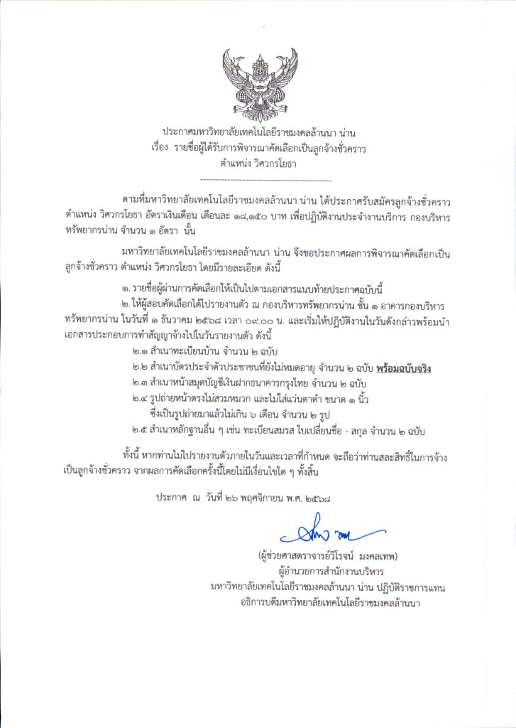 ประกาศมหาวิทยาลัยเทคโนโลยีราชมงคลล้านนา น่าน