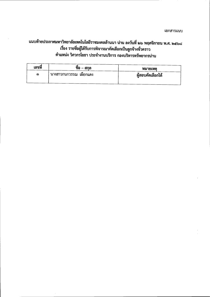 มหาวิทยาลัยเทคโนโลยีราชมงคลล้านนา น่าน จึงขอประกาศผลการพิจารณาคัดเลือกเป็นลูกจ้างชั่วคราว ตำแหน่ง วิศวกรโยธา โดยมีรายละเอียดแนบ