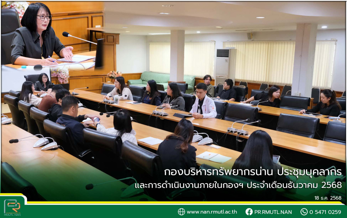 วันพฤหัสบดีที่ 18 ธันวาคม 2568 เวลา 10.00 น. นางนงเยาว์ สารเถื่อนแก้ว ผู้อำนวยการกองบริหารทรัพยากรน่าน ได้ประชุมบุคลากรและการดำเนินงานภายในกองฯ ประจำเดือนธันวาคม 2568 เพื่อติดตามการดำเนินงาน แจ้งข้อราชการ ปรึกษาหารือแนวทางการปฏิบัติงาน และร่วมแก้ไขปัญหาหรืออุปสรรคในการปฏิบัติงานของแต่ละด้าน เพื่อให้การปฏิบัติงานภายในกองฯเป็นไปด้วยความเรียบร้อย สนับสนุนการดำเนินงานด้านต่างๆของมหาวิทยาลัยได้อย่างมีประสิทธิภาพ ณ ห้องประชุมชมพูภูคา อาคารกองบริหารทรัพยากรน่าน