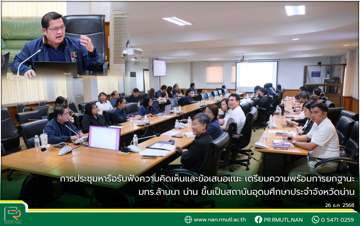 วันศุกร์ที่ 26 ธันวาคม 2568 เวลา 13.30 น. ผู้ช่วยศาสตราจารย์ ดร.วิโรจน์ มงคลเทพ (ผู้อำนวยการสำนักงานบริหารมหาวิทยาลัย) ได้จัดประชุมหารือรับฟังความคิดเห็นและข้อเสนอแนะจากผู้บริหาร รองคณบดี หัวหน้าสาขา หัวหน้าหลักสูตร หัวหน้างาน และเจ้าหน้าที่ ในการเตรียมความพร้อมการยกฐานะ มหาวิทยาลัยเทคโนโลยีราชมงคลล้านนา น่าน ขึ้นเป็นสถาบันอุดมศึกษาประจำจังหวัดน่าน ณ ห้องประชุมชมพูภูคา อาคารกองบริหารทรัพยากรน่าน