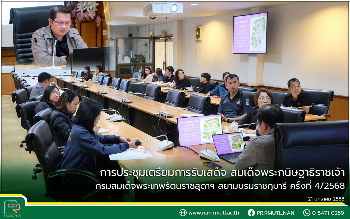 วันพุธที่ 21 มกราคม 2569 เวลา 15.00 น. ณ ห้องประชุมชมพูภูคา อาคารกองบริหารทรัพยากรน่าน / ผู้ช่วยศาสตราจารย์ ดร.วิโรจน์ มงคลเทพ ผู้อำนวยการสำนักงานบริหารมหาวิทยาลัย พร้อมผู้บริหารและคณะกรรมการดำเนินงาน ได้ร่วมประชุมเพื่อติดตามความก้าวหน้าการดำเนินงาน การเตรียมการ และชี้แจงแนวทางปฏิบัติการรับเสด็จฯ สมเด็จพระกนิษฐาธิราชเจ้า กรมสมเด็จพระเทพรัตนราชสุดาฯ สยามบรมราชกุมารี ในการเสด็จพระราชดำเนินปฏิบัติพระราชกรณียกิจในพื้นที่จังหวัดน่าน และ ณ มหาวิทยาลัยเทคโนโลยีราชมงคลล้านนา น่าน วันที่ 5 กุมภาพันธ์ 2569