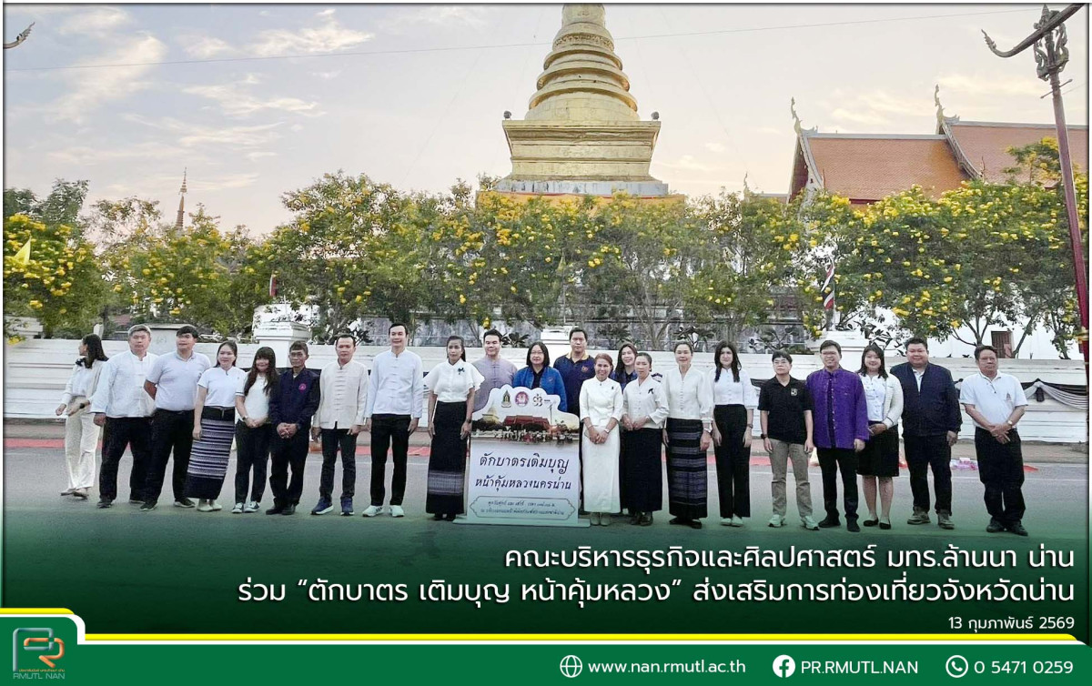 วันศุกร์ที่ 13 กุมภาพันธ์ 2569 เวลา 06.30 น. ผู้ช่วยศาสตราจารย์ ดร.ชุติสร เรืองนาราบ รองคณบดีคณะบริหารธุรกิจและศิลปศาสตร์ พร้อมคณาจารย์คณะ ได้เข้าร่วมกิจกรรม "ตักบาตร เติมบุญ หน้าคุ้มหลวง" เพื่อเป็นการส่งเสริมการท่องเที่ยวจังหวัดน่าน และส่งเสริมให้พุทธศาสนิกชนชาวไทยได้ปฏิบัติกิจกรรมทางพระพุทธศาสนาถวายเป็นพุทธบูชา จัดโดยสำนักงานวัฒนธรรมจังหวัด