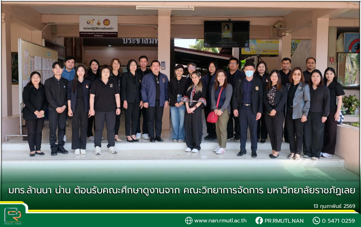 วันศุกร์ที่ 13 กุมภาพันธ์ 2569 เวลา 09.00 น. ผู้ช่วยศาสตราจารย์ ดร.วิโรจน์ มงคลเทพ ผู้อำนวยการสำนักงานบริหารมหาวิทยาลัย พร้อมผู้บริหารและเจ้าหน้าที่ ให้การต้อนรับคณะศึกษาดูงานจาก คณะวิทยาการจัดการ มหาวิทยาลัยราชภัฏเลย เข้าศึกษาดูงานด้านการบริหารจัดการงานบริหารงานทั่วไป งานบริการวิชาการและวิจัย และงานประกันคุณภาพ ภายใต้โครงการ "การเรียนรู้แนวทางการพัฒนางานในสายงานของบุคลากรสำนักงานคณบดีคณะวิทยาการจัดการ มหาวิทยาลัยราชภัฏเลย ประจำปีงบประมาณ 2569" ณ ห้องประชุมชมพูภูคา และสำนักงาน อาคารกองบริหารทรัพยากรน่าน