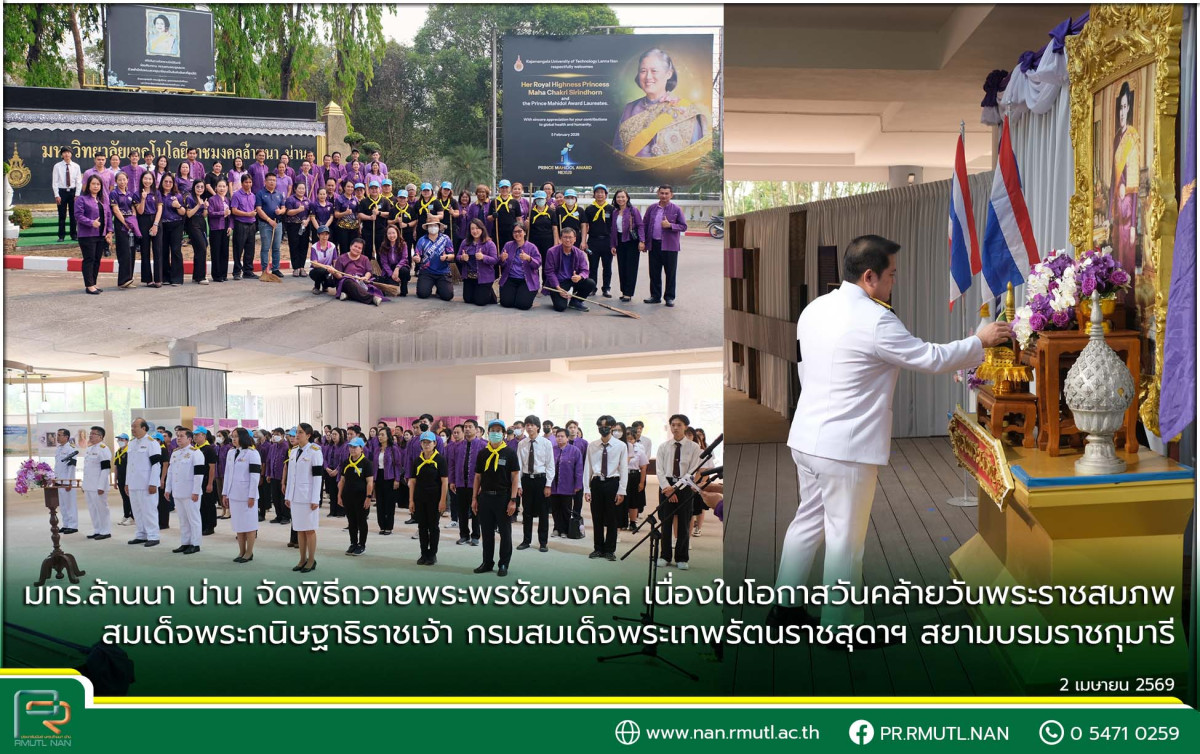 มทร.ล้านนา น่าน จัดพิธีถวายพระพรชัยมงคล เนื่องในโอกาสวันคล้ายวันพระราชสมภพ สมเด็จพระกนิษฐาธิราชเจ้า กรมสมเด็จพระเทพรัตนราชสุดาฯ สยามบรมราชกุมารี 2 เมษายน 2569