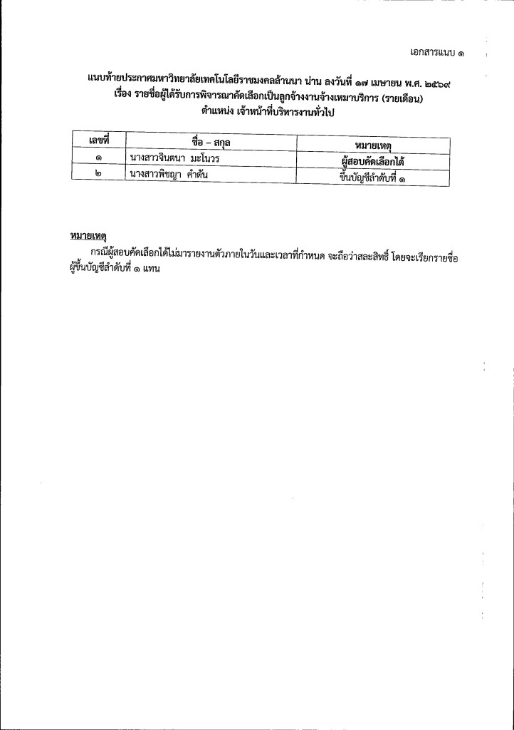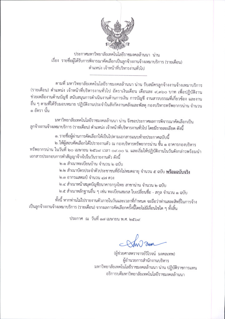 มหาวิทยาลัยเทคโนโลยีราชมงคลล้านนา น่าน จึงขอประกาศผลการพิจารณาคัดเลือกเป็นลูกจ้างงานจ้างเหมาบริการ (รายเดือน) ตำแหน่ง เจ้าหน้าที่บริหารงานทั่วไป โดยมีรายละเอียด ดังแนบท้ายประกาศ