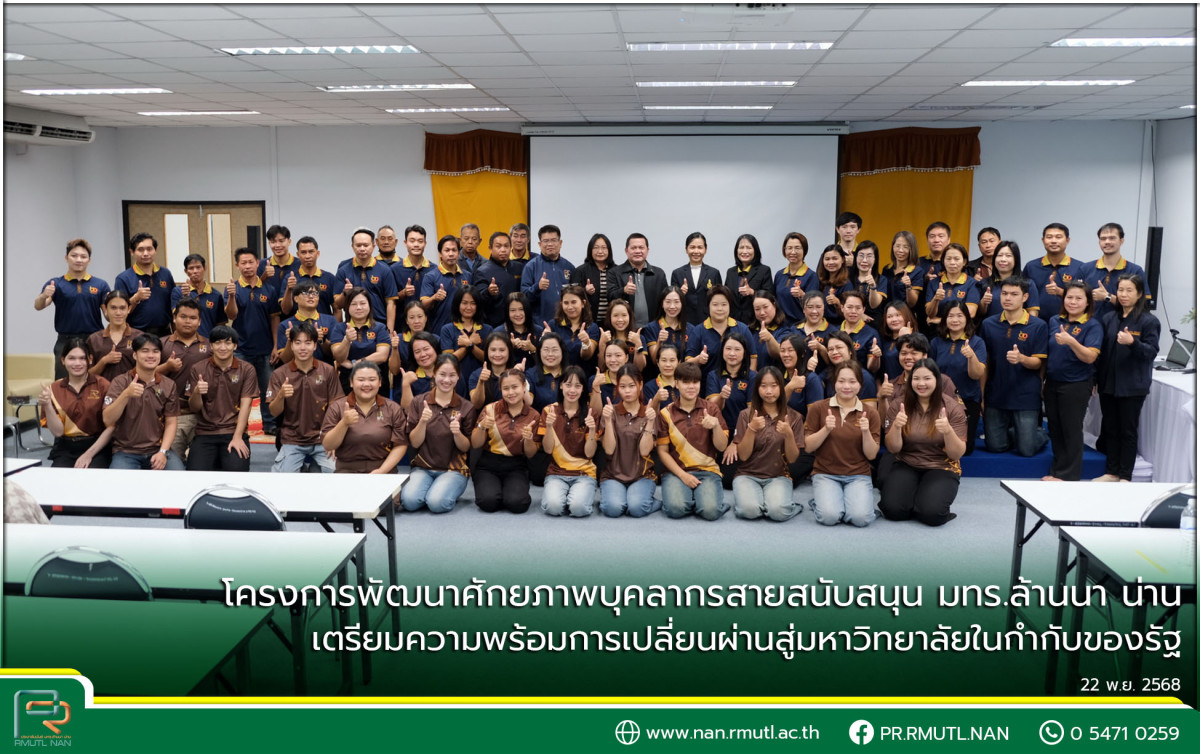 วันเสาร์ที่ 22 พฤศจิกายน 2568 ณ อาคารวิทยบริการ / กองการศึกษาน่าน มหาวิทยาลัยเทคโนโลยีราชมงคลล้านนา น่าน ได้ดำเนินโครงการพัฒนาศักยภาพบุคลากรสายสนับสนุน มทร.ล้านนา น่าน เพื่อพัฒนาศักยภาพบุคลากรสายสนับสนุนให้มีความรู้ ทักษะ และทัศนคติที่เหมาะสมต่อการปฏิบัติงานในยุคดิจิล ส่งเสริมบุคลิกภาพลักษณ์และมารยาทในการทำงานที่สะท้อนความเป็นมืออาชีพ เสริมสร้างความน่าเชื่อถือแก่องค์กร อีกทั้งเป็นการเตรียมความพร้อมในการเปลี่ยนผ่านสู่การเป็นมหาวิทยาลัยในกำกับของรัฐอย่างมีประสิทธิภาพ โดย ผู้ช่วยศาสตราจารย์ ดร.วิโรจน์ มงคลเทพ (ผู้อำนวยการสำนักงานบริหารมหาวิทยาลัย) เป็นประธานพิธี นางนลัทพร คูหา (ผู้อำนวยการกองการศึกษาน่าน) กล่าวรายงาน