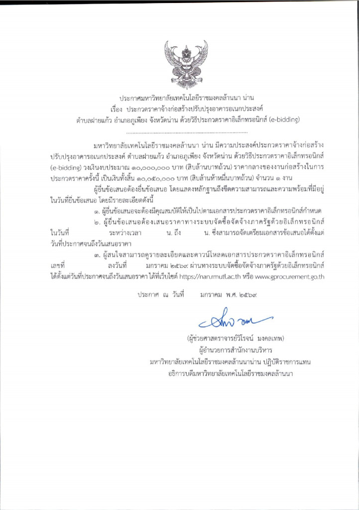 ดาวน์โหลดเอกสาร >> ร่างประกาศและประกวดราคาจ้างก่อสร้างปรับปรุงอาคารเอนกประสงค์ ตำบลฝายแก้ว อำเภอภูเพียง จังหวัดน่าน ด้วยวิธีประกวดราคาอิเล็กทรอนิกส์ (e-bidding)